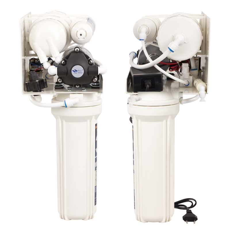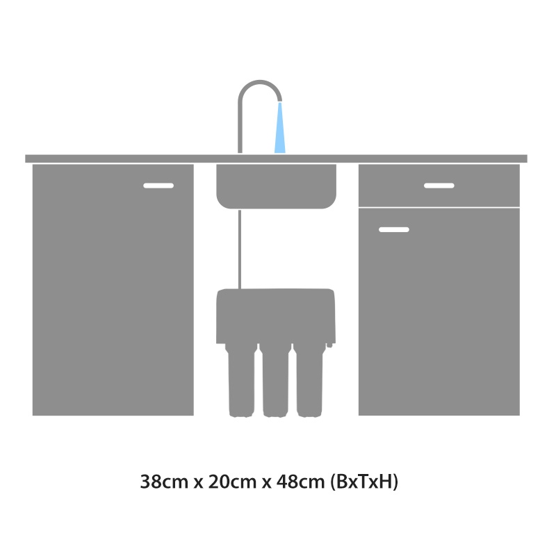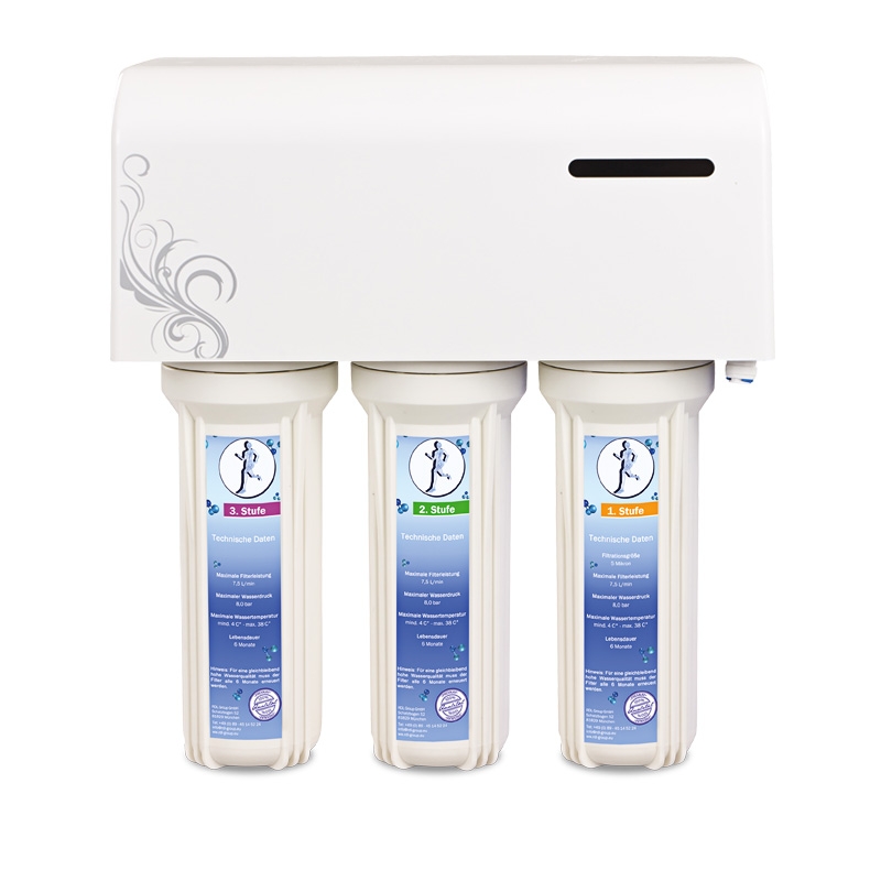 Zuerst wird dein Leitungswasser durch drei Vorfilter von groben Partikeln wie z.B. Sand, Rost und Schmutzstoffe befreit. Weiterhin werden bereits in der Vorfilterung Schwebstoffe und organische Verunreinigungen entfernt bzw. reduziert. Anschließend wird das Wasser in eine leistungsstarke Druckerhöhungspumpe geleitet. Diese baut einen optimalen Wasserdruck im Wasserfilter auf, wodurch du die maximale Filterleistung erhältst. Die nächste Filterstufe ist die Membrane. Diese entfernt aus deinem Wasser alle Schadstoffe, Geruchsstoffe und Geschmacksstoffe. Die Schadstoffe werden direkt in das Abwasser gespült, so dass die Filter nicht als Sammelstelle für Bakterien dienen – ein entscheidender Vorteil dieser Umkehrosmose Technologie. Nachdem dein Wasser nahezu 100% von allen Schadstoffen befreit worden ist, wird dieses durch einen Aktivkohlenachfilter geleitet, der dem Wasser einen unvergleichbar frischen und belebenden Geschmack verleiht. Anschließend kommt das Wasser frisch gefiltert aus deinem Wasserhahn – so viel du möchtest!